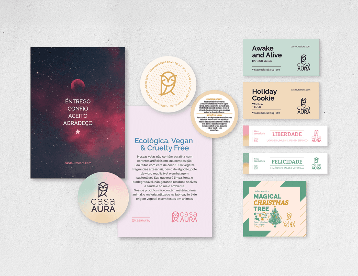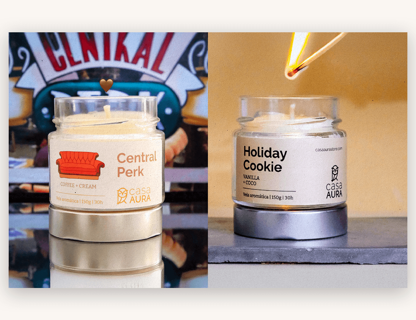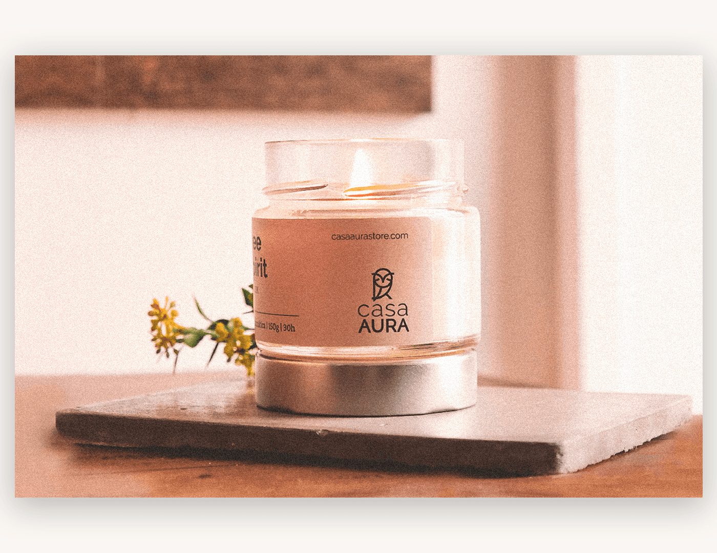 Casa Aura es una marca de velas artesanales ecológicas, veganas y cruelty-free, fabricadas en Brasil con ingredientes naturales y respetuosos con el medioambiente. Nace con el propósito de fomentar momentos de bienestar, calma y autocuidado en la vida cotidiana, conectando los sentidos con espacios de pausa y presencia. El símbolo principal de la marca es el búho, elegido por su carga simbólica y espiritual. Representa protección, sabiduría y guía para quienes están transitando procesos de cambio o transformación personal. Este concepto se convierte en el eje narrativo de la identidad, transmitiendo cercanía, acompañamiento y luz en cada etapa.