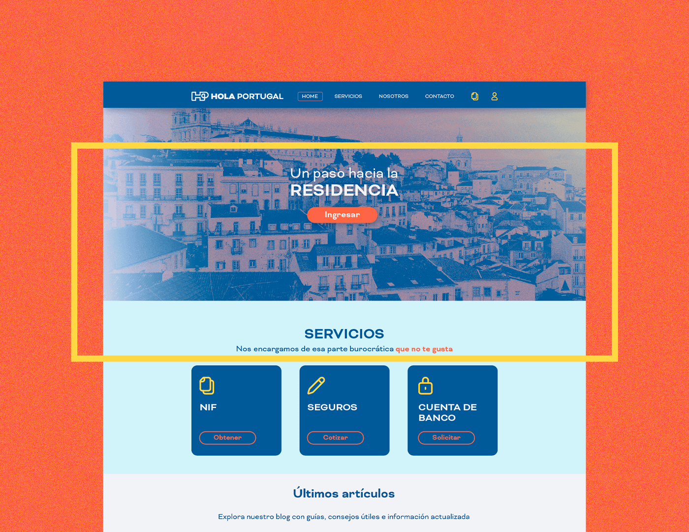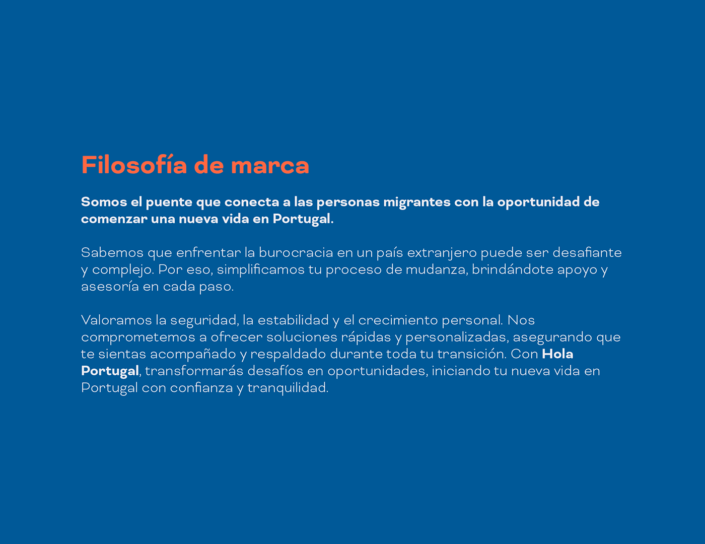 Hola Portugal es una empresa dedicada a acompañar a personas migrantes en su proceso de mudanza y regularización en Portugal. El proyecto partía de una necesidad clara: ordenar y fortalecer una marca que trabaja con situaciones sensibles, donde la confianza, la claridad y el acompañamiento humano son determinantes. El desafío era construir una identidad que transmitiera seguridad sin volverse fría ni burocrática.