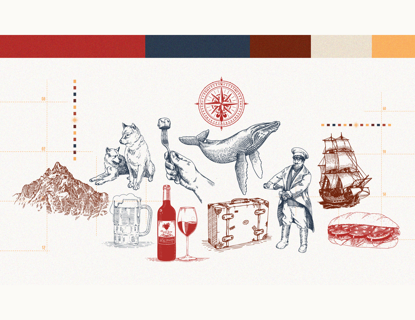 La identidad visual se diseñó para reflejar la rudeza, autenticidad y aventura del extremo sur. Trabajamos con una estética inspirada en el mundo de los pioneros patagónicos: tipografías de carácter artesanal, ilustraciones que evocan cartografía antigua y una paleta de tonos naturales vinculados al paisaje fueguino.